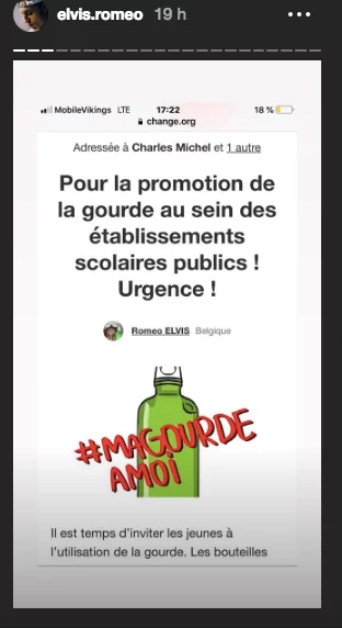 In early January 2019, he launched the #MaGourdeAMoi (My own gourd) hashtag. This campaign was so successful that he later published a petition to Charles Michel, the Belgian Prime Minister to ban plastic bottles in public schools and install water points for students.